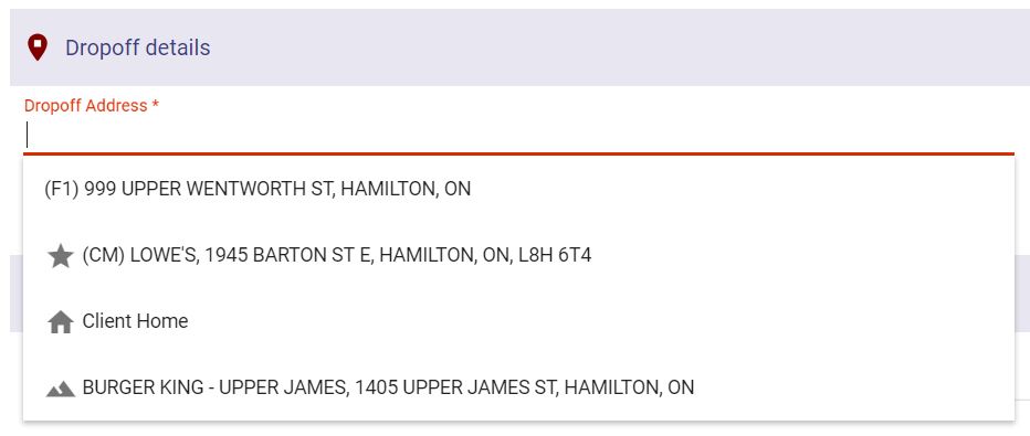 You can either click the box “Drop Off Address” and select from the drop-down menu or type the drop off address manually in the box.